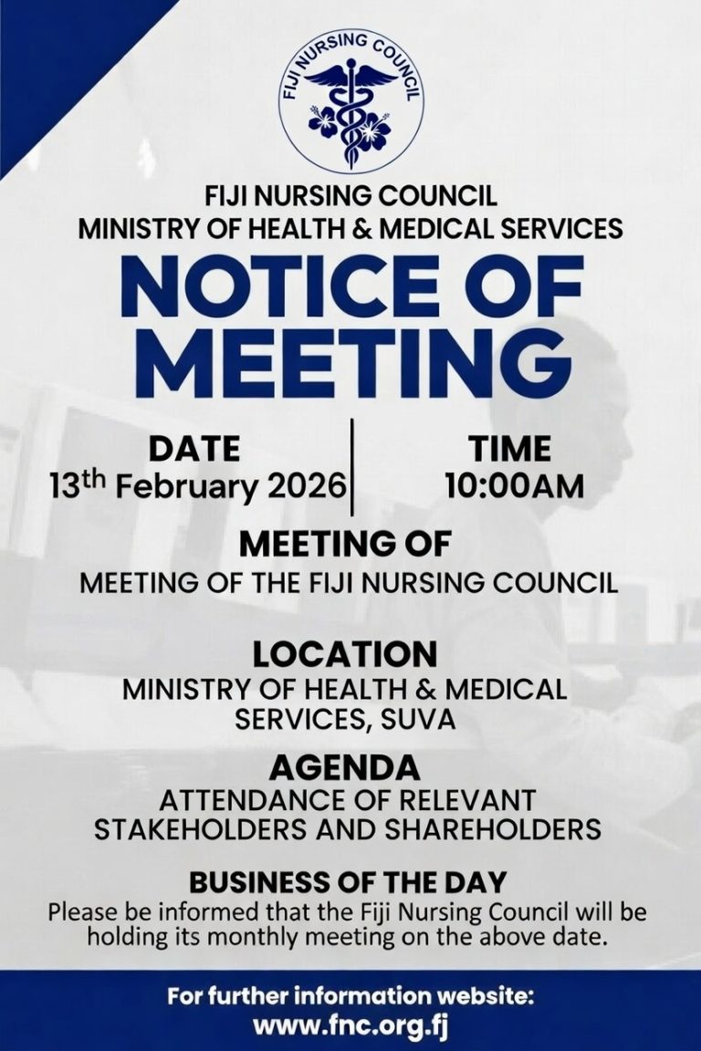 This milestone gathering will be held on Friday, 13th February 2026, at the Ministry of Health Compound, Suva. The meeting will be officially opened by the Permanent Secretary for Health and Medical Services, who serves as Chairperson of the Fiji Nursing Council.