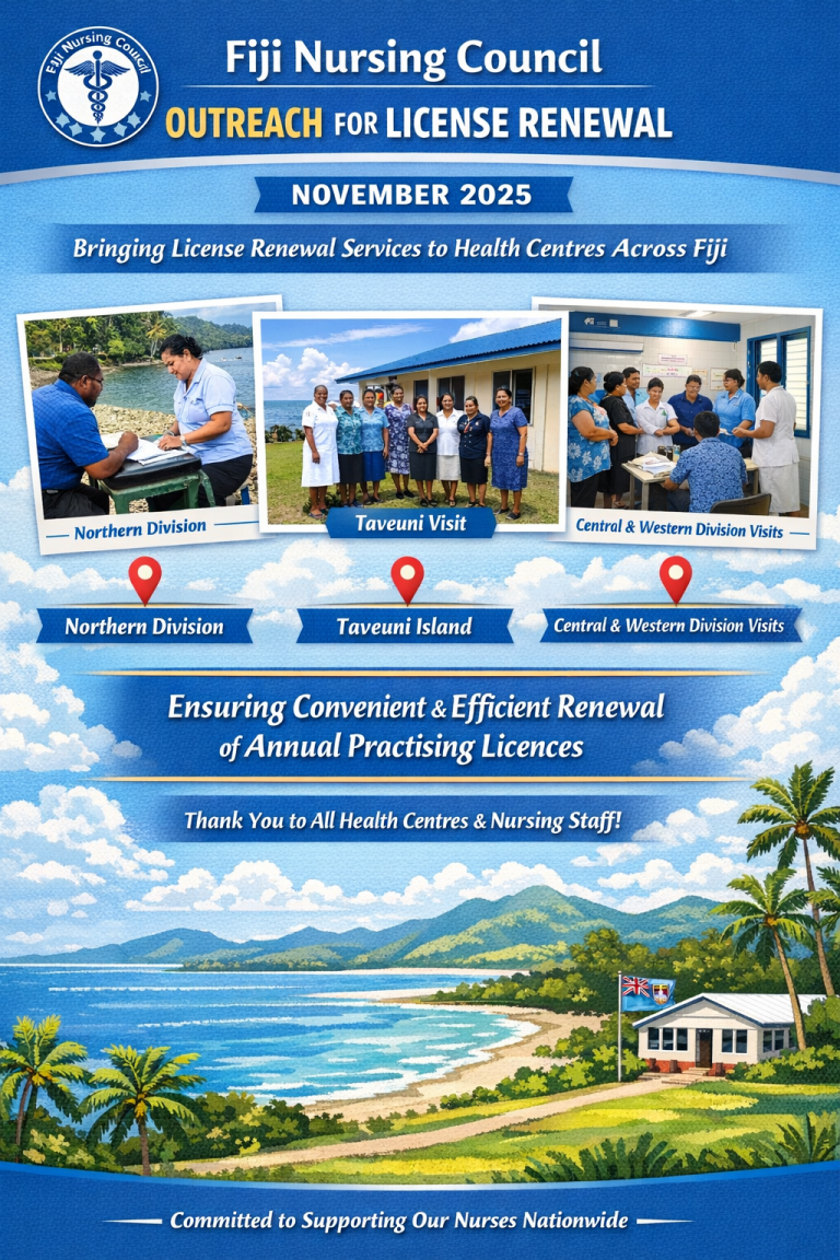 Throughout the month of November 2025, the Fiji Nursing Council (FNC) team conducted an extensive outreach initiative across health centers around Fiji to facilitate the renewal of nurses’ Annual Practicing Licenses. This nationwide exercise was aimed at improving accessibility and ensuring timely license renewals for nurses serving in various regions of the country.